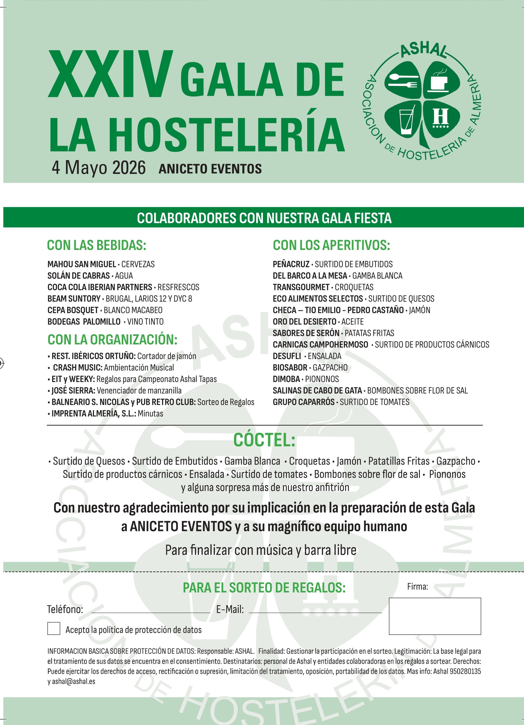 ALMERÍA.– La Asociación Provincial de Empresarios de Hostelería de Almería (ASHAL) celebrará el próximo 4 de mayo, a partir de las 19:00 horas, su tradicional Gala de la Hostelería de Almería, que tendrá lugar en Aniceto Eventos (Restaurante Aniceto, en El Alquián), consolidándose como uno de los encuentros más relevantes del sector en la provincia.